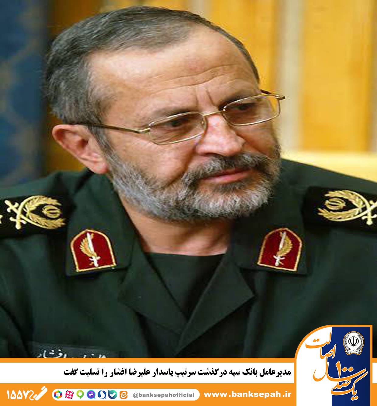 دکتر ابراهیمی مدیرعامل بانک سپه با صدور پیامی عروج ملکوتی پاسدار سرافراز اسلام سرتیپ علیرضا افشار را تسلیت گفت. به گزارش پایگاه اطلاع رسانی بانک سپه؛ متن پیام دکتر آیت...