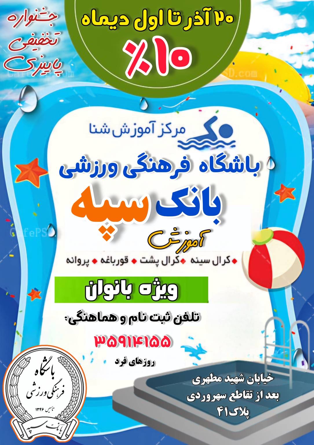 🔷️از ۲۰ آذر تا اول دیماه 🔷️آموزش شنا بانوان